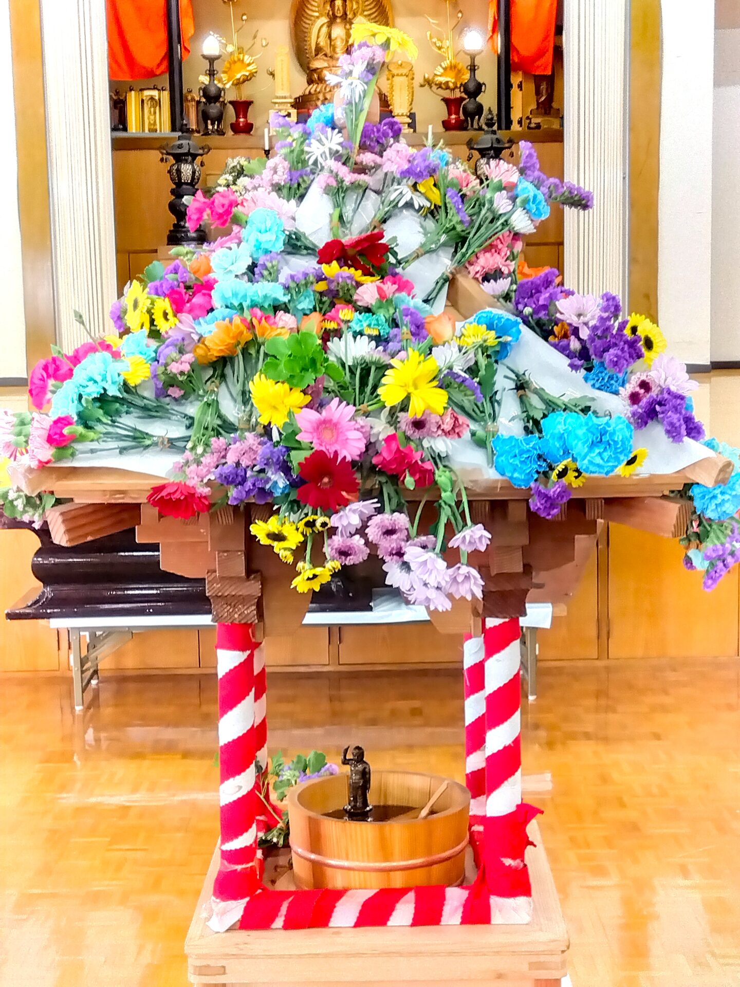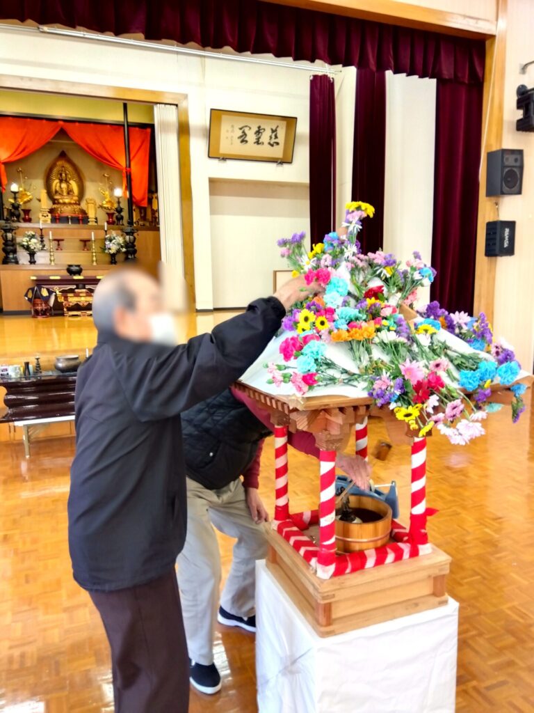 灌仏会(かんぶつえ)とは、お堂(花御堂)に色鮮やかな花々を飾り、中心に誕生仏の像を安置し、柄杓を使って甘茶をかけ、お釈迦様の誕生を祝う行事です。